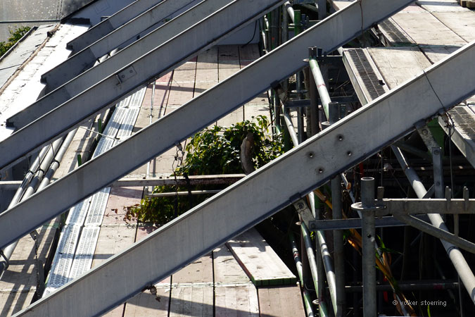Bei Bauarbeiten geht auch mal etwas zu Bruch. Das große Tropenhaus des Botanischen Gartens bekommt ein neues Dach und ist deshalb eingerüstet. Die Pflanzen wurden zum größten Teil ausgelagert.